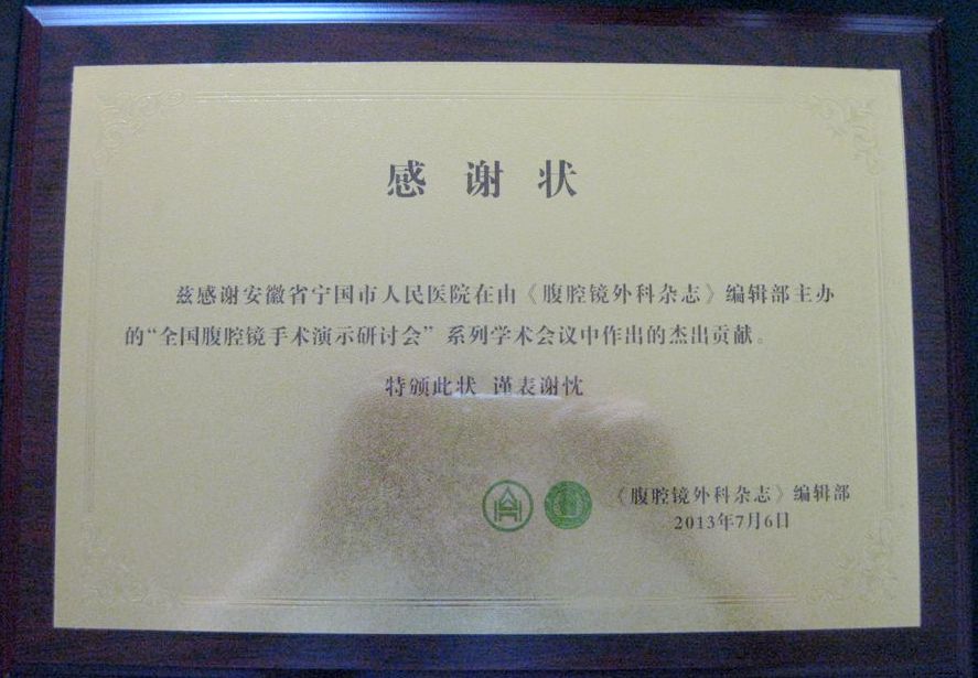 ?????? 7月5日,“第二十屆全國腹腔鏡手術(shù)演示研討會(huì)”在山東濟(jì)南山東大學(xué)附屬齊魯醫(yī)院召開,我院有幸成為安徽省內(nèi)唯一一家受邀單位,外二科潘文主任及劉堅(jiān)醫(yī)師參加此次大會(huì)。 ? 《腹腔鏡外科雜志》特別授予我院“特殊貢獻(xiàn)獎(jiǎng)”獎(jiǎng)牌。大會(huì)對目前國內(nèi)前沿的腹腔鏡手術(shù)進(jìn)行了深刻研討和精彩的手術(shù)演示。 ??? |