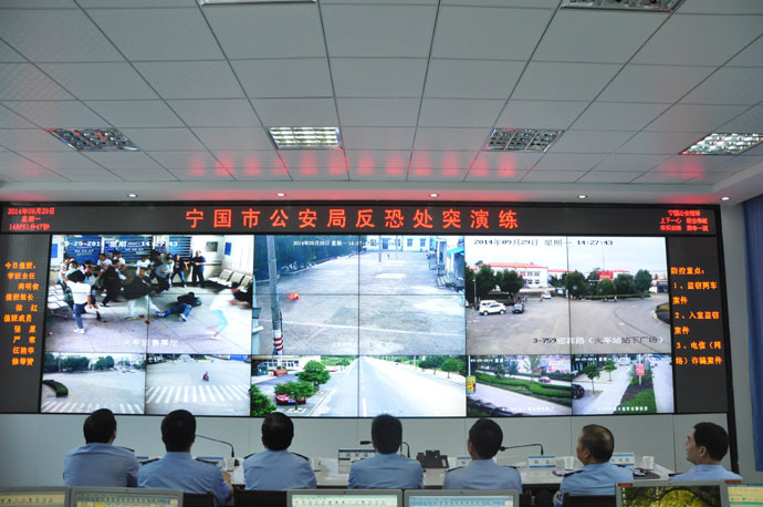 ??? 14時(shí)36分,被暴恐分子劫持的車(chē)輛出現(xiàn)在寧國(guó)大道,并向宣城方向逃竄。指揮中心通過(guò)視頻監(jiān)控和350兆系統(tǒng),調(diào)集沿途警力進(jìn)行追擊、攔截、合圍。14時(shí)40分,被暴恐分子劫持的車(chē)輛在城郊五芳路路段被警方前后夾擊,暴恐分子被當(dāng)場(chǎng)擒獲。至此,各項(xiàng)科目的演練順利結(jié)束。