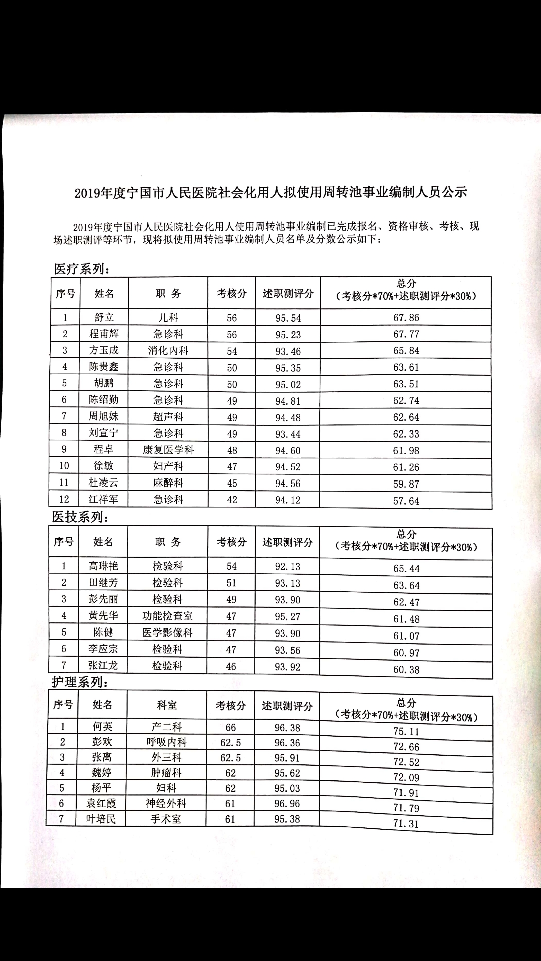 2019年度寧國市人民醫(yī)院社會化用人使用周轉池事業(yè)編制人員公示