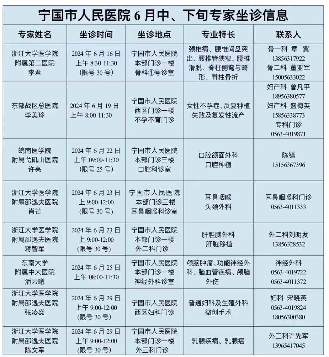 寧國市人民醫(yī)院6月中、下旬專家坐診信息