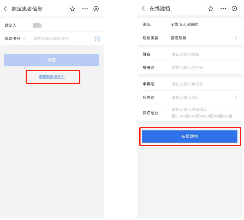 2、建檔時,患者需填入姓名、身份證號、手機號、居住地等信息,點擊“在線建檔”,即可建檔成功。 溫馨提示:首次使用微信小程序建檔的患者,點擊“沒有就診卡號”可直接建檔