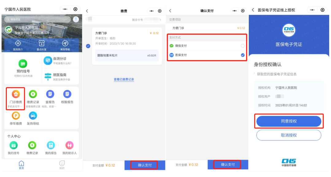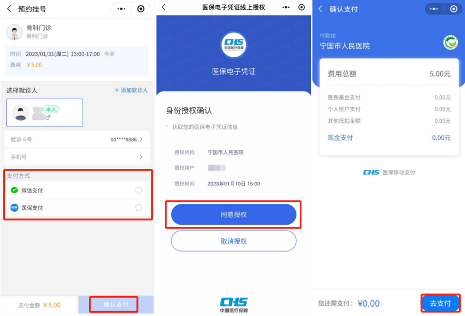 1.2支付時選擇【醫(yī)保支付】系統(tǒng)會自動跳轉(zhuǎn)到醫(yī)保電子憑證授權(quán)頁面,點擊【同意授權(quán)】,按照提示完成支付即可,支付成功后可在【我的掛號】中查看掛號詳情。